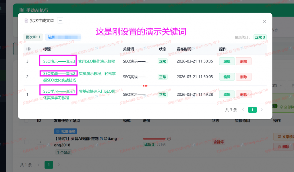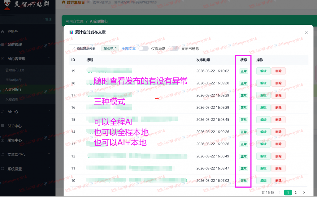第三:混合模式,AI降级后,为了保证正常生成发布,会全自动本地模式接管,多重保障,实现高质量内容输出。(整个过程,无需人工任何操作,全程AI接管,完全释放双手,在开发这套程序过程中,设计了150多种交叉逻辑,耗时86天,不断测试,完善,抗住百万级的蜘蛛抓取收录。)