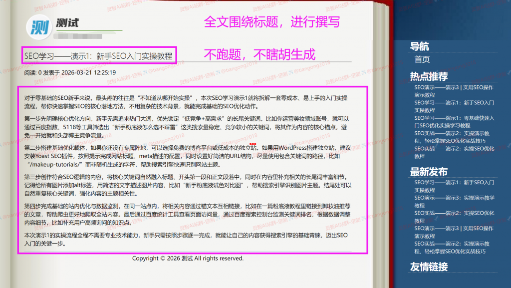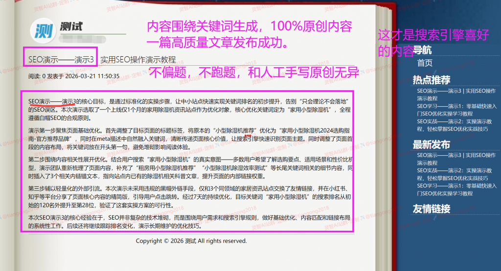 1、依托前沿大模型原生内容生成架构,内容原创度达到100%,新增防屏蔽词功能!!!(拒绝采集、随机句子、组装等低质量,低原创度内容。搜索引擎极度反感这种高重复的垃圾内容,轻则降权,重者K站,基本这个域名就报废了)。