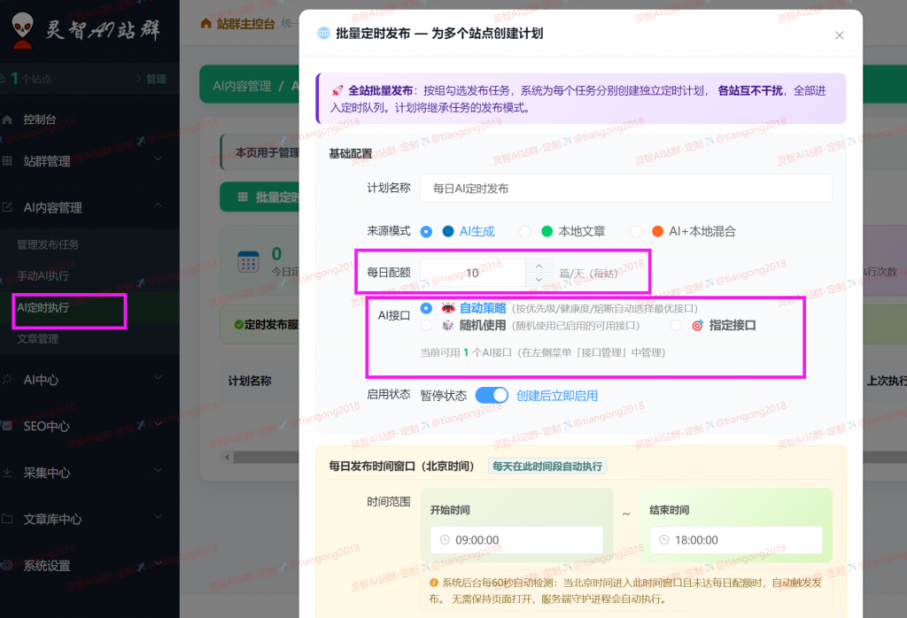 第一:AI模式(首推),配置好模型接口,全自动,会根据预先设置的关键词,全自动围绕关键词/或者标题,进行生成发布,整个流程,无需人工干预。内容围绕关键词或者标题生成,不会偏离,更不会胡乱生成,更不会文不对题,和人工手动撰写编辑发布的无任何区别。